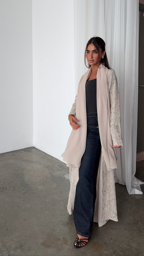 A soft ivory abaya with delicate textured shimmer. Light, refined, and effortlessly elegant - perfect for day or evening wear with a touch of sparkle.